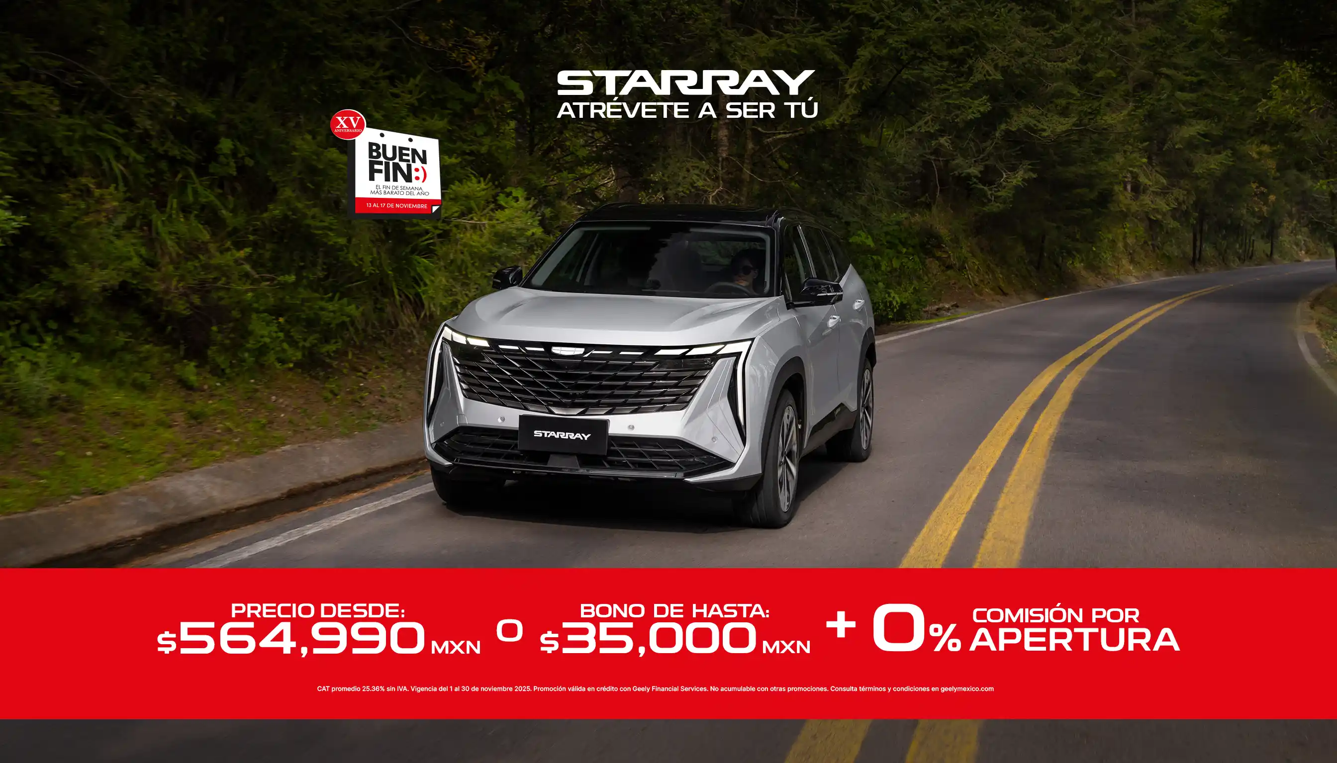 El precio especial de $564,990 MXN aplica al utilizar el bono de $35,000 a precio. Aplica únicamente a través de Geely Financial Services (BBVA México S.A., Institución de Banca Múltiple), para el modelo Starray 2025 en su versión GL 2.0T, sobre un precio de $599,990 MXN bono aplicado a precio es de $35,000 MXN (IVA Incluido no aplica seguro por un año gratis, y no es acumulable con otras promociones. Aplica 2.5% de comisión por apertura en plan BASE o 0% Comision por apertura utilizando el plan BUEN FIN